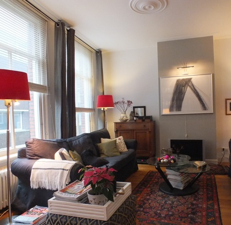 Our sitting room. I have since added an antique chair and a dark green/black glass designer’s coffee table where the ottoman is in the picture. Also, the rug has been replaced with a checkered white/black/grey/beige one. I prefer the one in the picture I think…..